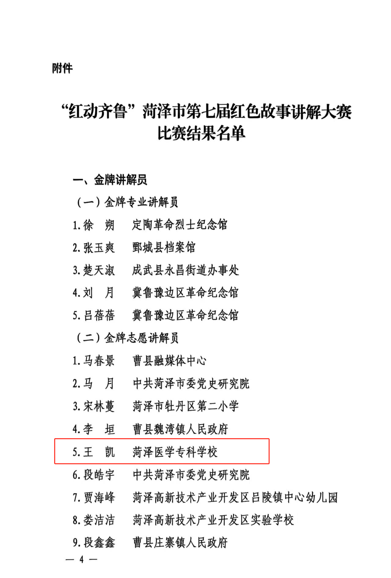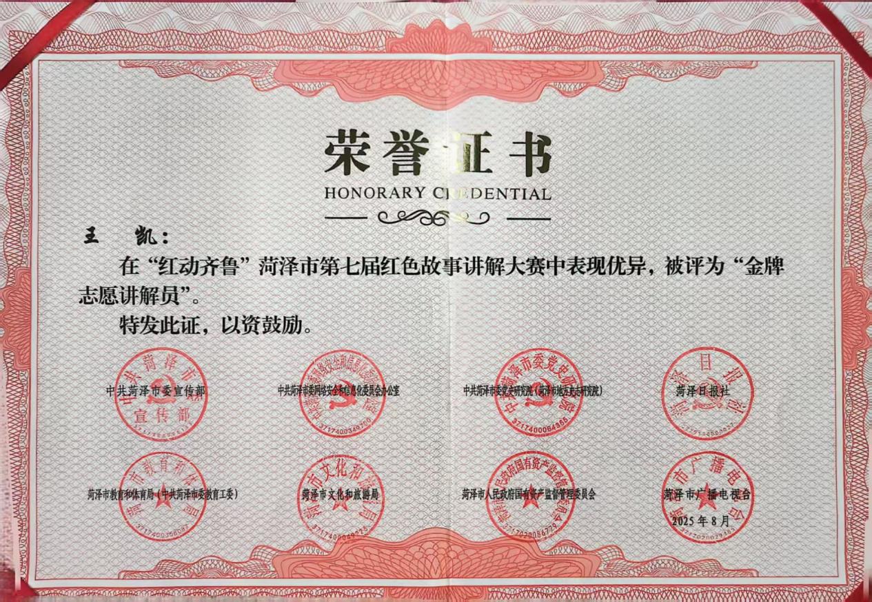 近日,“红动齐鲁”菏泽市第七届红色故事讲解大赛决赛在曹县党校圆满落幕,我校两名教职工参加决赛。其中,党委宣传部王凯老师凭借出色的表现,荣获“金牌志愿讲解员”称号,我校同时荣获大赛“优秀组织单位”称号。