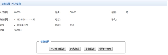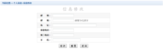 点击个人信息界面的个人信息修改,显示1.2-2所示的个人信息维护界面。在相应的输入框,输入需要修改的个人信息,点击“修改按钮”完成个人信息维护。未保存前,点击“重置”按钮,还原个人信息。