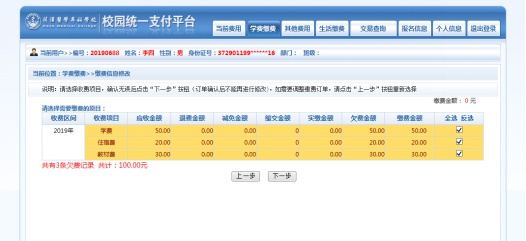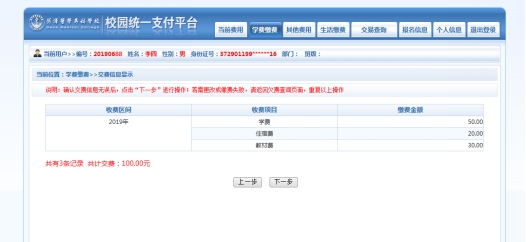 确认缴费信息。如图3-3所示。点击“下一步”按钮。