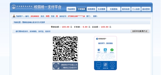 通过微信扫码支付时,请打开手机微信/支付宝/建行手机网银 ”扫一扫” 功能,扫描网页上的二维码。请确认商户收款方为:菏泽医学专科学校;