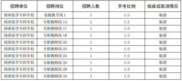 菏泽医学专科学校2022年公开招聘工作人员岗位核减或取消情况公告
