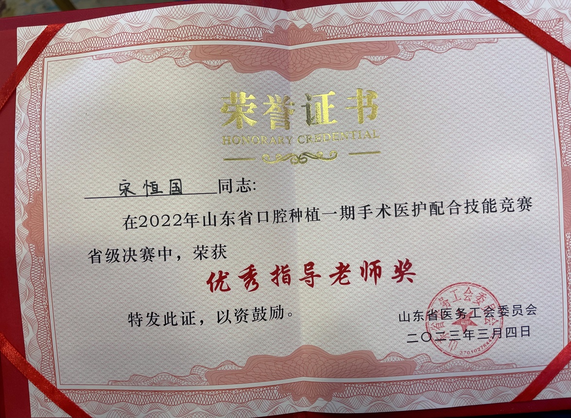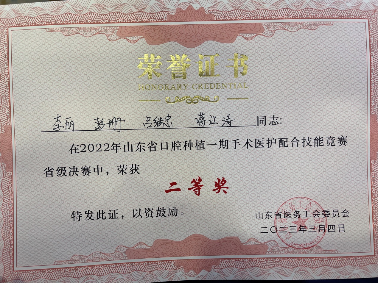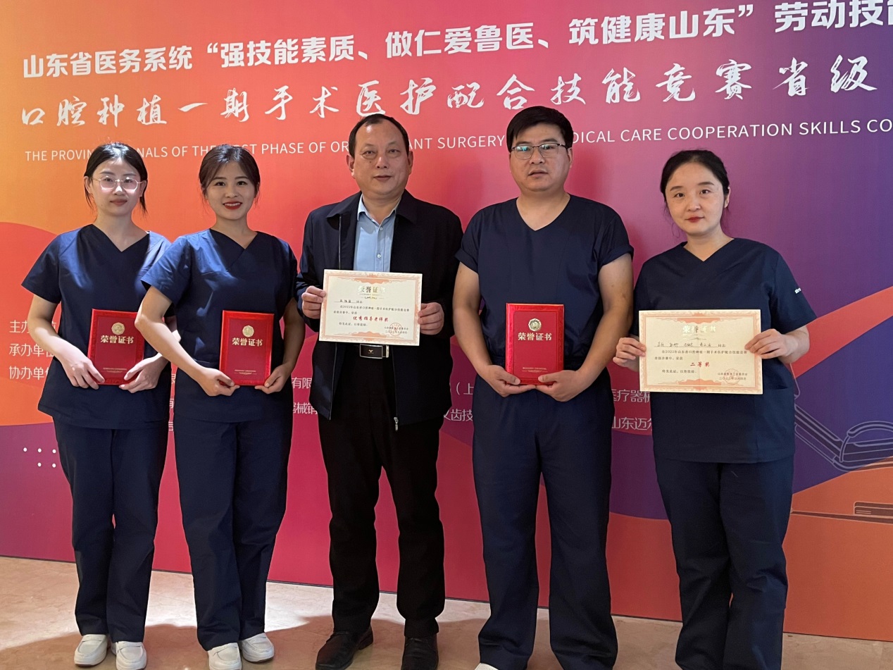3月4日至5日,山东省医务系统“强技能素质,做仁爱鲁医,筑健康山东”劳动技能竞赛口腔种植一期手术医护配合技能竞赛决赛在济南举行,我校口腔医护团队荣获二等奖,宋恒国主任荣获优秀指导老师。