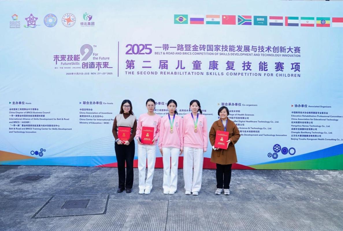 11月21日至23日,2025一带一路暨金砖国家技能发展与技术创新大赛儿童康复技能赛项总决赛在宁波圆满落幕,我校康复治疗技术专业学生陈姝灿、耿雅如分别荣获二等奖、三等奖,周蕊老师荣获优秀指导教师奖,我校同时获优秀组织奖。